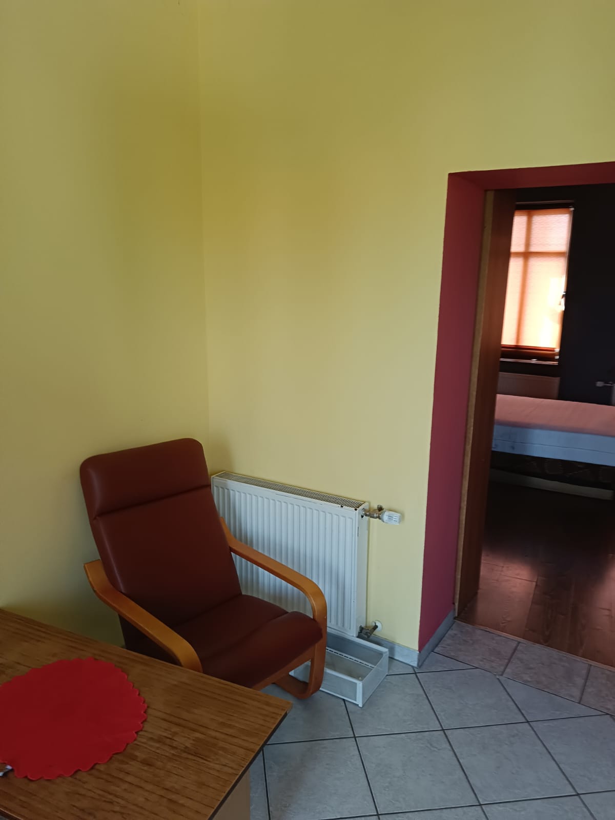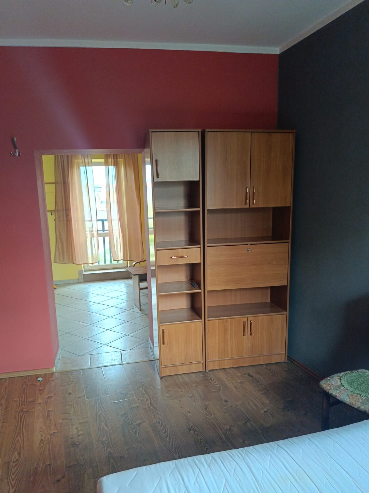 - Podłogi w pokojach to drewno, w kuchni i łazience – płytki.